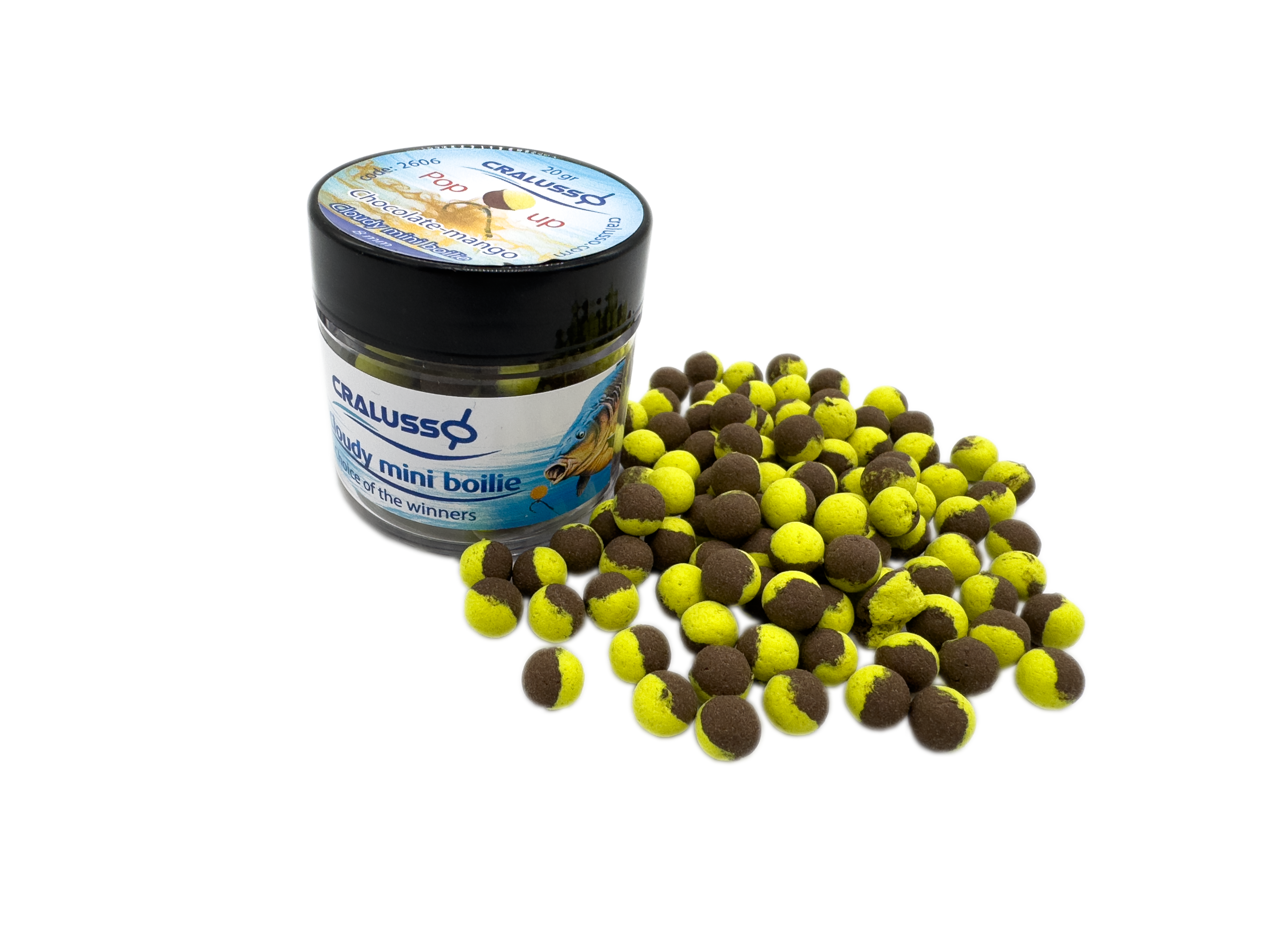 Kulki typu pop-up o zapachu czekolady z mango. Ich szczególną zaletą jest to, że po wrzuceniu do wody wytwarzają bardzo atrakcyjną dla ryb chmurę w kolorze żółtym.