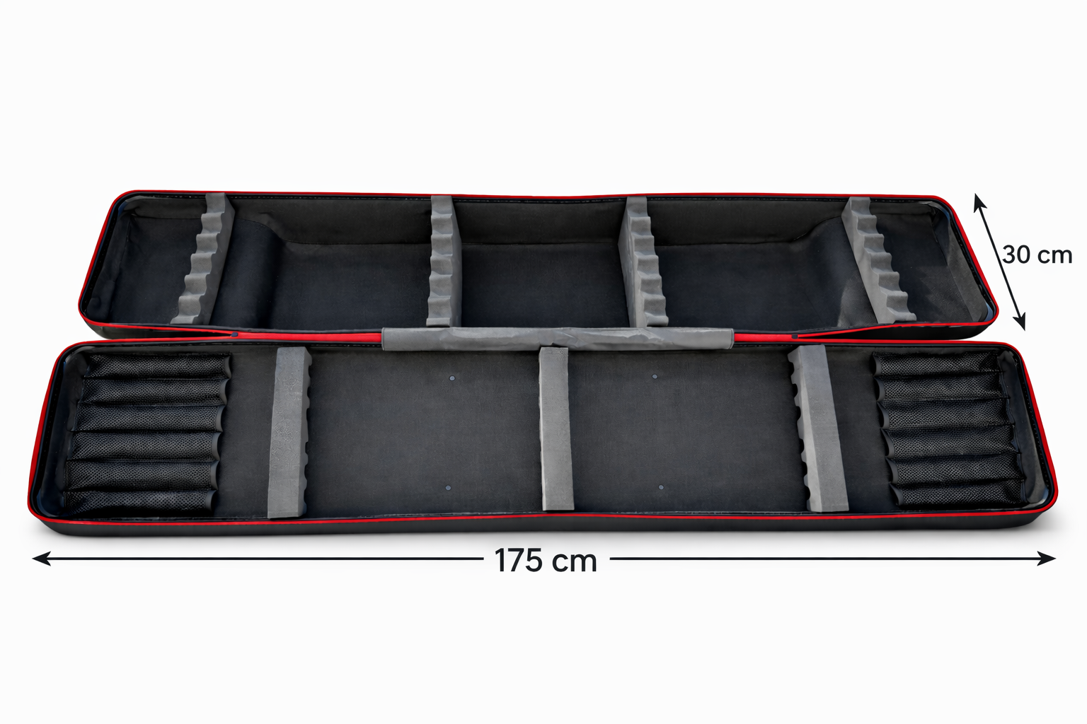 Wewnątrz zastosowano specjalny system zapobiegający przemieszczaniu się wędzisk i kołowrotków. Dzięki temu blanki, przelotki oraz korpusy kołowrotków są stabilne w transporcie, co ogranicza ryzyko otarć i uszkodzeń nawet na dłuższych trasach.